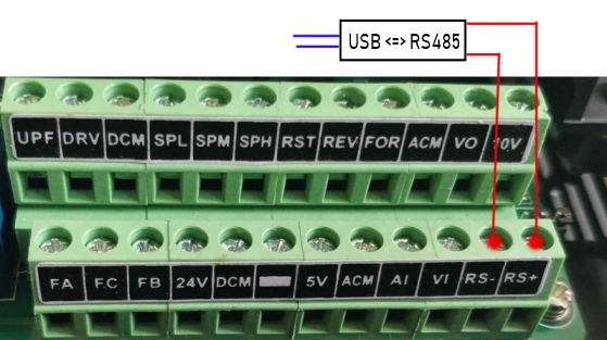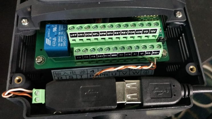 Podłączenie falownika z komputerem jest widoczne na zdjęciach. Wystarczą do tego zadania dwa przewody. Następnie musimy zadbać o takie samo ustawienie parametrów transmisji po obu stronach.